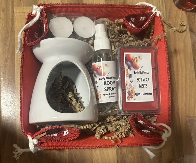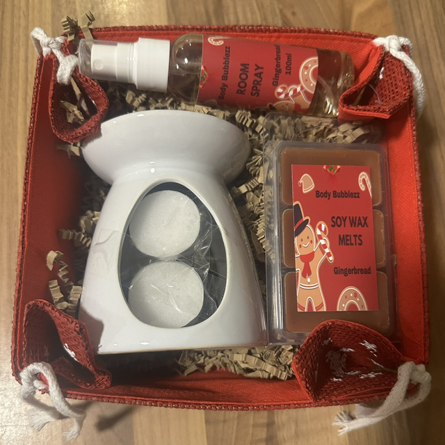 Set includes white wax burner, 2 tea lights, room spray and wax snap bar. The perfect Christmas gift for a loved one.